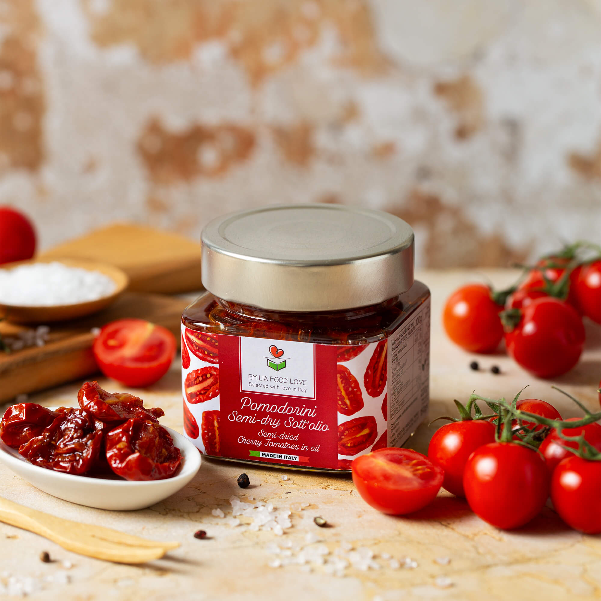 Less famous but even more versatile than their “cousins,” our semi-dried cherry tomatoes are perfect for pizza, focaccia, croutons, and bruschetta, as well as traditional pasta dishes. They pair beautifully with fresh cheeses, fish, cured meats, and more flavorful ingredients like olives, capers, and anchovies, adding a touch of vibrant color and delicious originality to all your recipes.